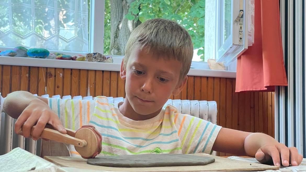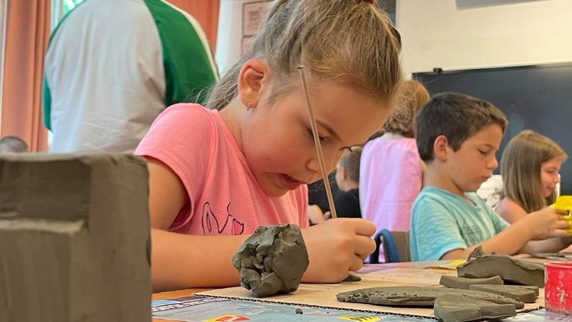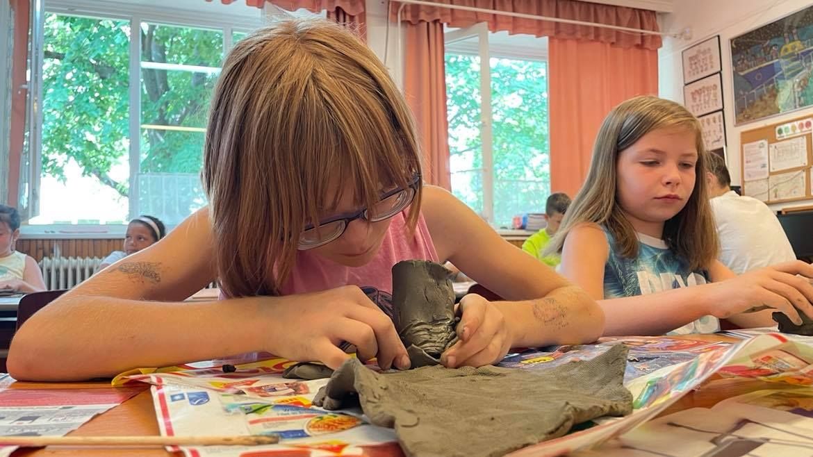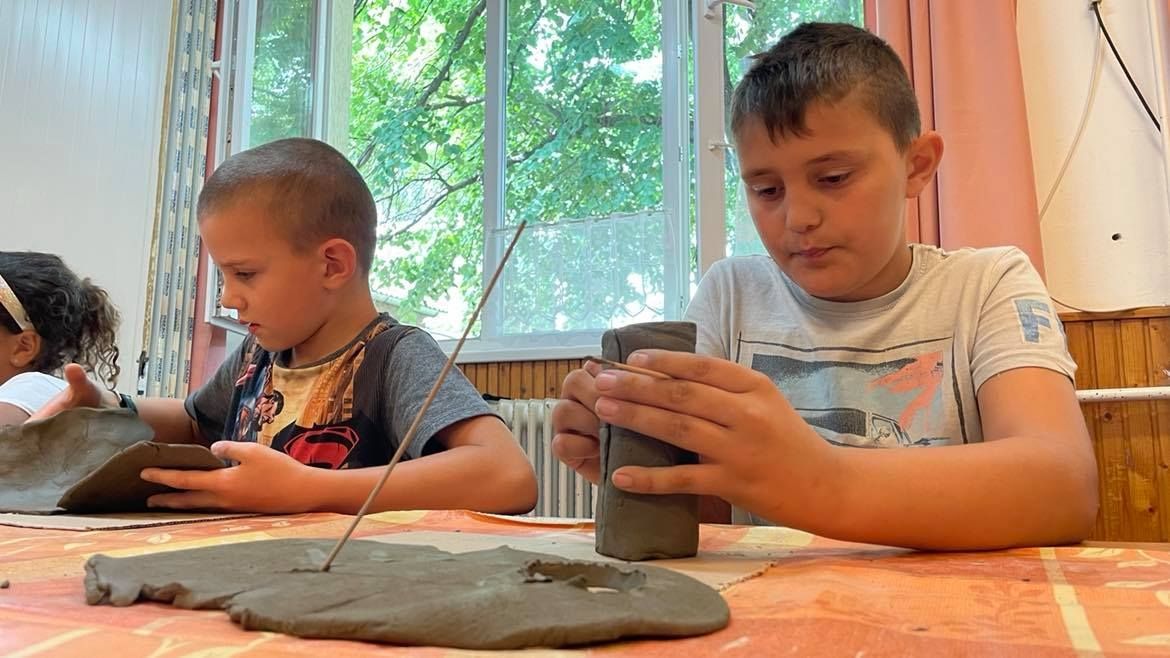 Ott jártunkkor épp agyagozáson vettek részt a nyári napközi résztvevői S. Császár Anna irányításával. Sorra készültek a tálkák, házikók és a sok figura, amit a gyerekek megálmodtak.