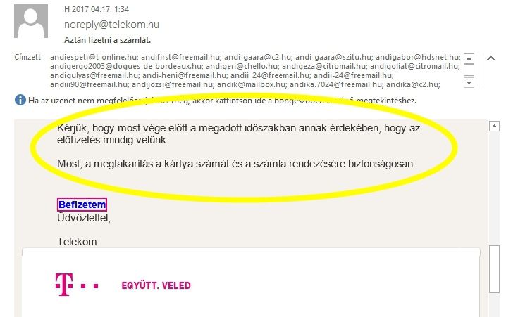 Több kiskunhalasi lakos internetes postafiókjában is felbukkant egy e-mail, mely első ránézésre úgy tűnik, hogy az egyik országosan ismert mobilszolgáltatótól érkezett. A levélben egy elmaradt számlabefizetésre hívják fel a postafiók tulajdonosának figyelmét, majd pár kattintás után már utalni is lehet a pénzt. Ezt azonban ne tegye meg senki, hiszen feltehetően csalók próbálják megkárosítani a gyanútlan embereket.