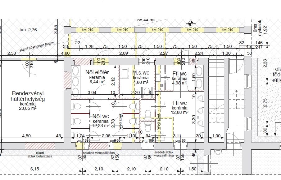 - női wc 18.67 m2 (előtér: 6.44 m2 3 db mosdóval, WC: 12,23 m2 6 db wc fülkével,)