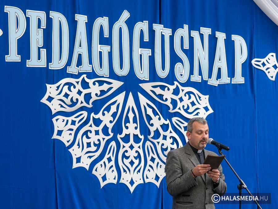 A városi-járási pedagógusnapi rendezvényt a Himnusz közös eléneklésével kezdték a jelenlévők, majd Pősz Attila moderátor Seffer Attilát, a Kiskunhalasi Alsóvárosi Főplébánia plébánosát kérte fel az ünnepi köszöntő megtartására. A plébános II. Szent János Páltól idézett beszéde elején, aki egy kanadai látogatása során kifejezte egy pedagógusi közösségben, hogy a társadalom egyik legfontosabb feladatát végzik.