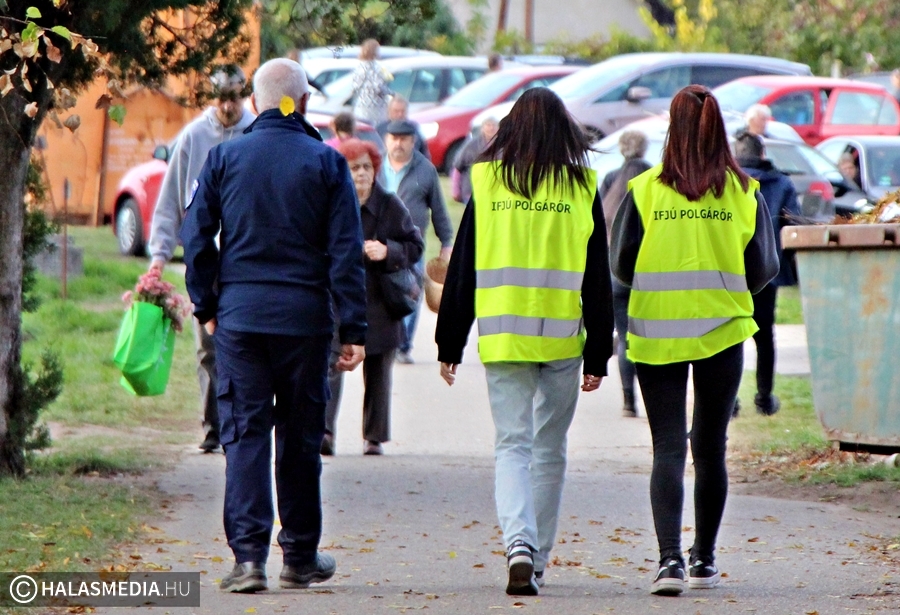 Folymatos jelenlétet igyekeznek biztosítani a rendészettel foglalkozó szervezetek csütörtök óta a kiskunhalasi temetők környékén, illetve a sírkerteken belül is. A Kiskunhalasi Rendőrkapitányság sűrűbb járőrözéssel, gyalogos szolgálattal is igyekeznek elejét venni annak, hogy a temetőbe látogatók bűncselekmény áldozatai legyenek. A közterület-felügyelők is ott vannak a halasi sírkertekben. A Kiskunhalas Városőrség és Polgárőr Egyesület csütörtök óta ad szolgálatot a temetőkben, illetve a környezetükben.