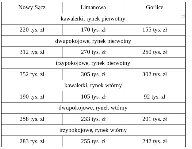 A költségek szempontjából legelőnyösebb a Gorlice, ahol a kínálat nem túl nagy, viszont az elsődleges piacon egy kétszobás lakás ára 20 e. złotyval alacsonyabb, mint Limanowában és több, mint 60 ezerrel alacsonyabb, mint Nowy Sącz-ban.