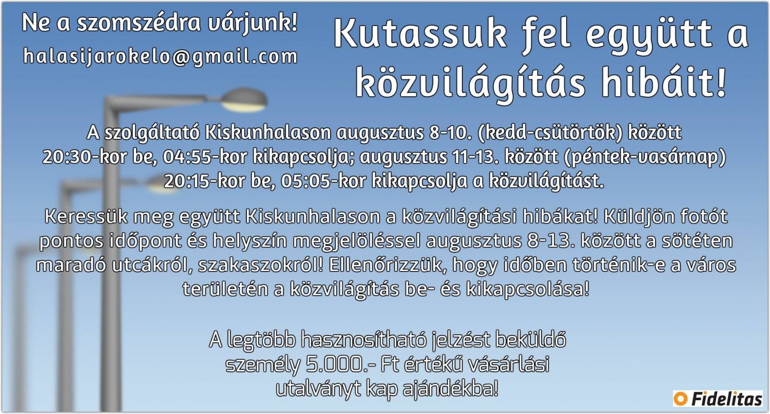 Újabb akciót szervez a Fidelitas Kiskunhalasi Szervezete. Ezúttal a helyi közvilágítással kapcsolatos észrevételeket, panaszokat várnak, a legtöbb hasznosítható bejelentést küldő vásárlási utalványt kap.