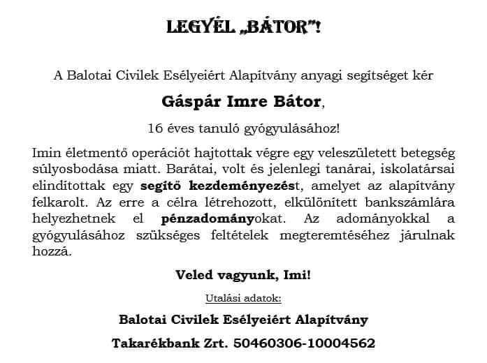 Nehéz helyzetbe került egy balotaszállási család. A 16 éves Gáspár Imre Bátor egy veleszületett betegség súlyosbodása miatt életmentő műtéten esett át. Szülei anyagi lehetőségei szűkösek, a napokban egy összefogás nyomán gyűjtés indult. A cél az, hogy Bátor környezetét, életfeltételeit a megváltozott körülményekhez igazítsák.