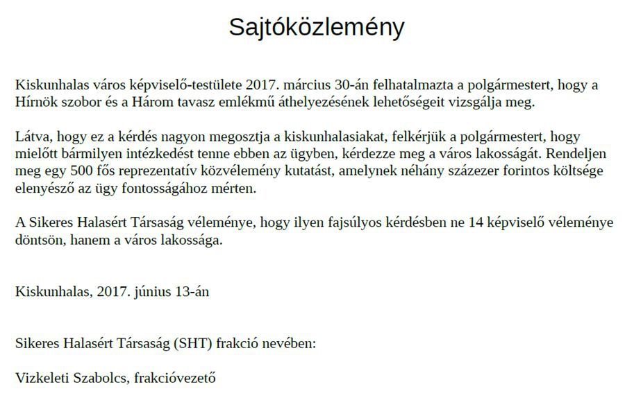 A Halasmédia szerkesztőségéhez péntek délután sajtóközleményt juttatott el Vízleleti Szabolcs frakcióvezető (címképen), a Sikeres Halasért Társaság (SHT) nevében. A közlemény Kiskunhalason, a Semmelweis téren álló Hírnök szobor és a Három tavasz emlékmű áthelyezésének lehetőségével összefüggésben fogalmazott meg álláspontot, amit változatlan formában közöl hírportálunk.