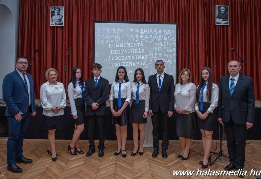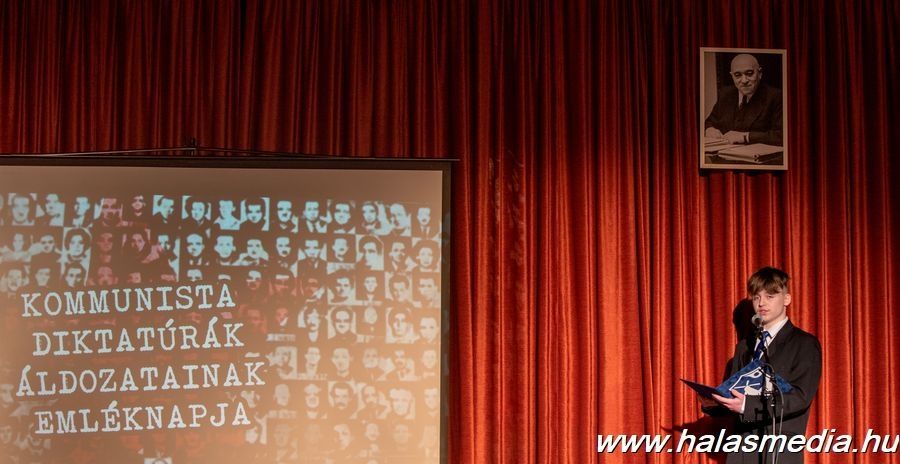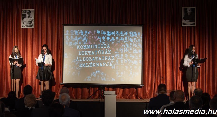 Péntek délután a városháza oldalán elhelyezett emléktábla előtt kezdődött a kommunista diktatúrák áldozataira történő megemlékezés Kiskunhalason. A résztvevők virággal, koszorúval, mécses gyújtással rótták le kegyeletüket a dombormű előtt, majd a Közösségek Házába vonultak. Ott Dr. Komáromi Szilárd, a Kiskunhalasi Szakképzési Centrum Vári Szabó István Szakképző Iskola és Kollégiuma igazgatója tartott emlékbeszédet, őt az intézmény diákjainak műsora követte.