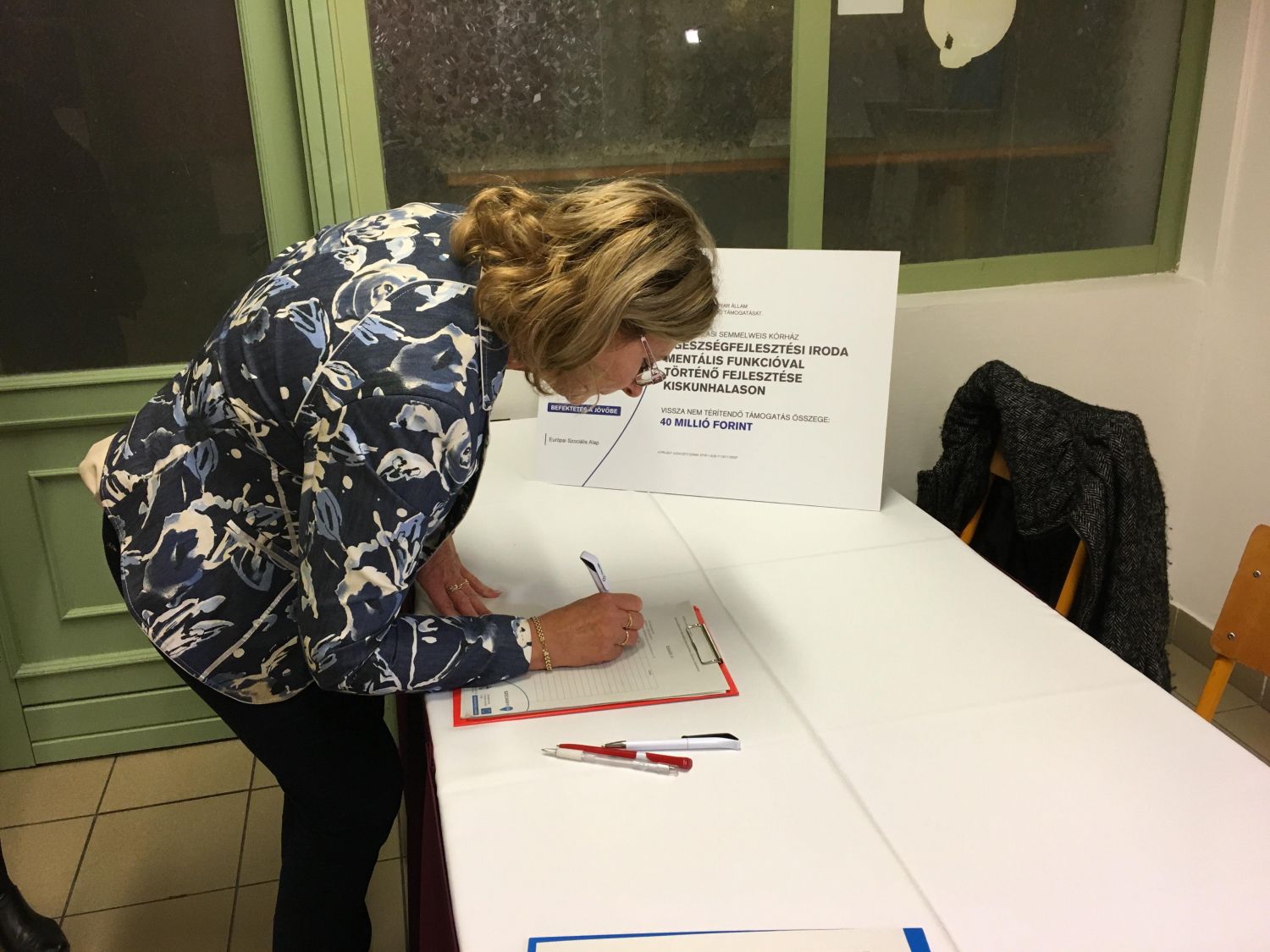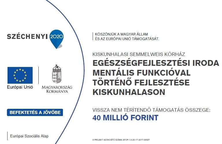 Az Egészségfejlesztési Iroda Mentális Funkcióval Történő Fejlesztése Kiskunhalason elnevezésű projektre (EFOP-1.8.20-17-2017-00027) a Kiskunhalasi Semmelweis Kórház 40 millió forintos támogatást nyert el Magyarország Kormánya és az Európai Unió jóvoltából, az Európai Szociális Alap finanszírozásával, a Széchenyi 2020 program keretében.