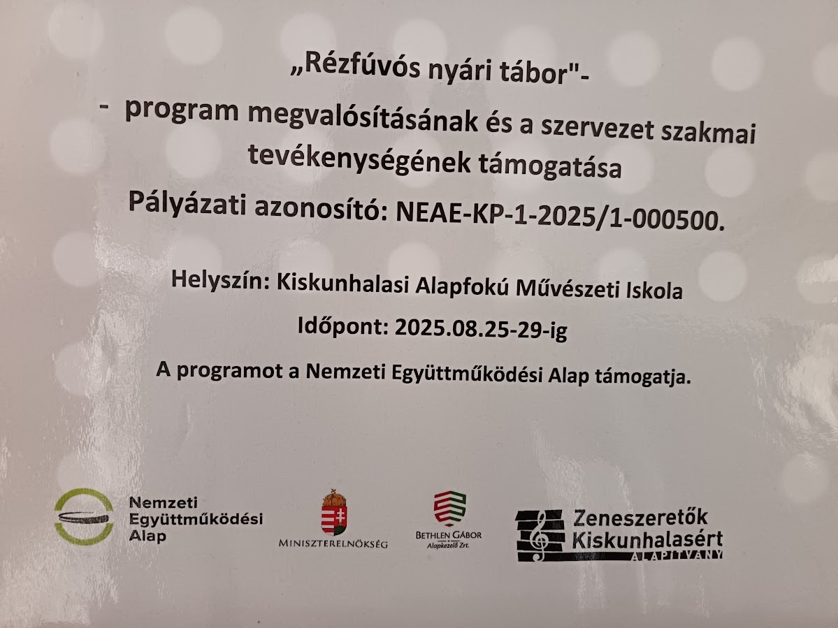 Az augusztus végi rézfúvós nyári tábort a Zeneszeretők Kiskunhalasért Alapítvány rendezte a Nemzeti Együttműködési Alap, a Miniszterelnökség és a Bethelen Gábor Alapkezelő Zrt. támogatásával, 2 és fél millió forint segítséggel..A szakmai program mellett a kikapcsolódásra is hangsúlyt helyeztek a táborban.