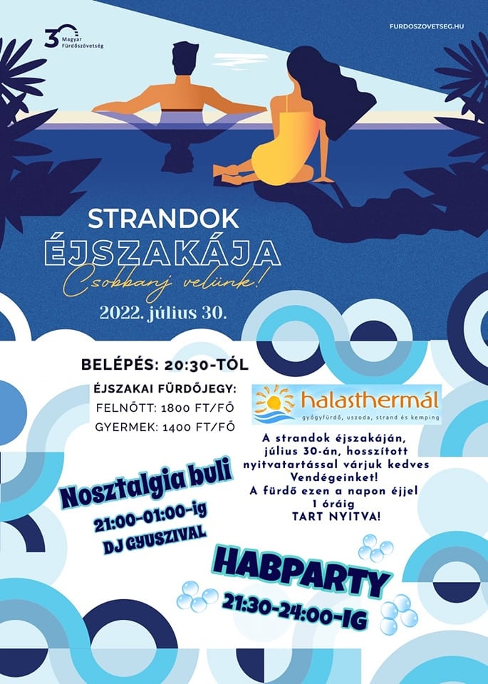 Éjszakai csobbanás nosztalgia bulival és habpartyval. Kiskunhalas idén is csatlakozott a Strandok éjszakája országos kezdeményezéshez. A Halasthermál gyógyfürdő, uszoda, strand és kemping július 30-án hosszított nyitvatartással áll a vendégek rendelkezésére, egészen éjjel 1 óráig lehet úszkálni, táncolni, kikapcsolódni.