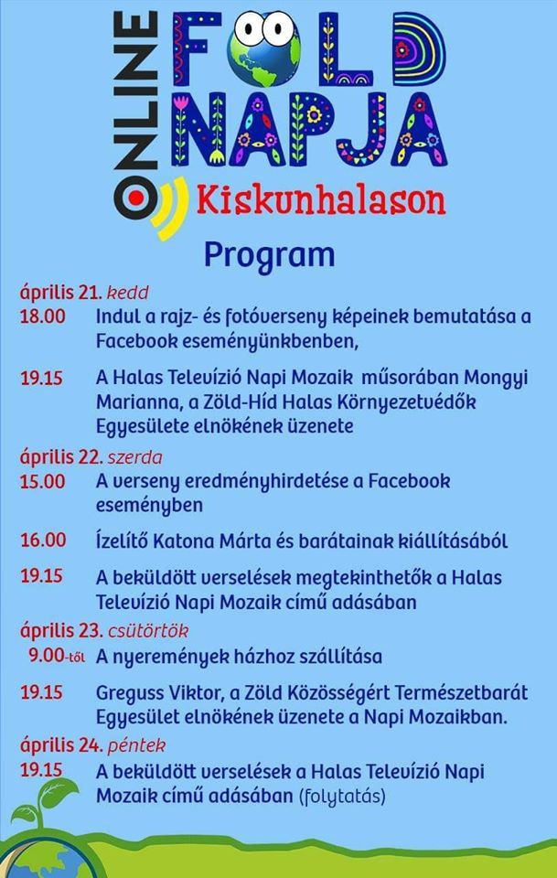 Mint arról korábban beszámoltunk, idén a kialakult vírushelyzet miatt online ünnepli meg Kiskunhalas a Föld napját. Szerdán egy Facebook eseményben lehet nyomon követni a színes, érdekes programokat. A szervező Halasi Média és Kultúra Kft. több pályázatot is hirdetett a Föld napjával kapcsolatban. Ezek beküldési határideje kedden este hat órakor volt, most pedig Önök dönthetnek arról, kik kapjanak alkotásaikkal díjakat.