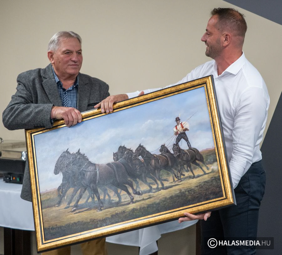 Volt itt egy nagyon komoly szakmai háttér, egy nagyon komoly szakmai munka, ami ezt az egész lovasbázist kiemelkedővé tette az országos, de akár lehet mondani túlzás nélkül, hogy a nemzetközi lovaséletben is. Ezekre az alapokra próbálunk építkezni mi is a manapság, amely hagyományokat szeretnénk tovább ápolni a jövőben. A legfontosabb, hogy meg kellett ezt teremteni, és mi nagyon hálásak vagyunk neked ezért. Annyit tudok csak mondani, hogy jó egészséget kívánok és hálásan köszönünk mindent.” Beszédét követően megajándékozta Szegedi Gábort a polgármester.