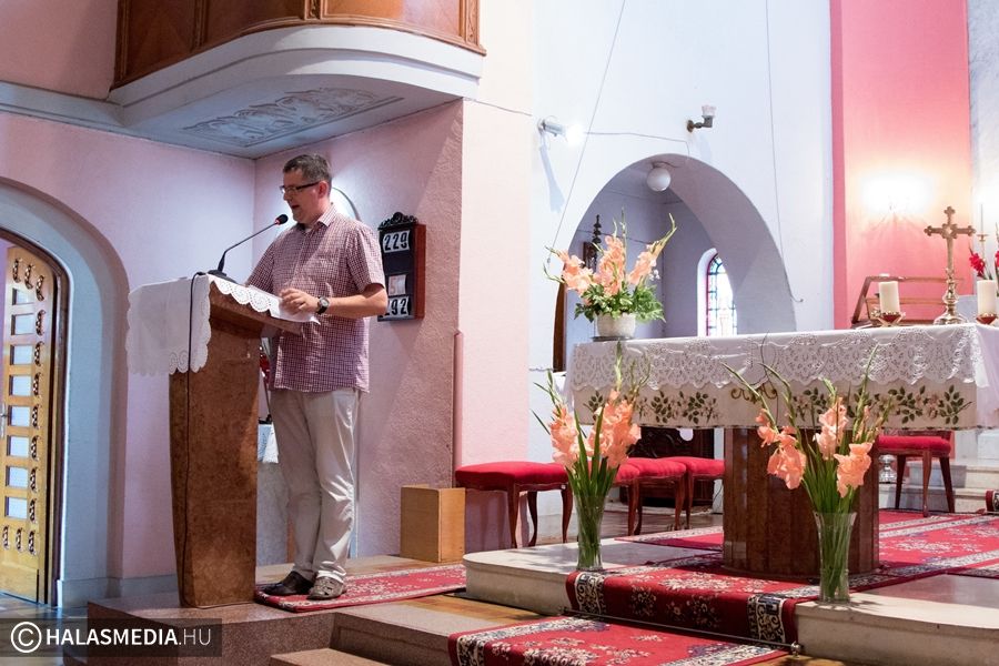 A Kosztolányi-szobor megkoszorúzása után, visszafelé Paskó Csaba kelebiai plébános és mesterszakács fogadta a csapatot, majd a csodaszép templom történetének ismertetése után megvendégelte a kerekeseket a híres kelebiai gurulós fánkkal.