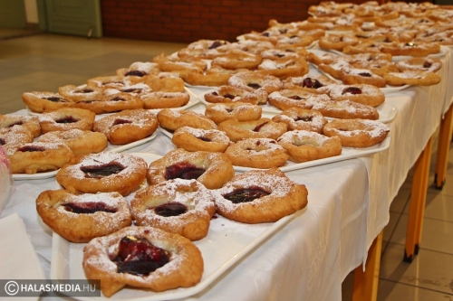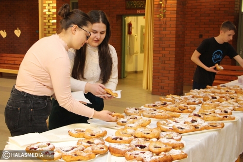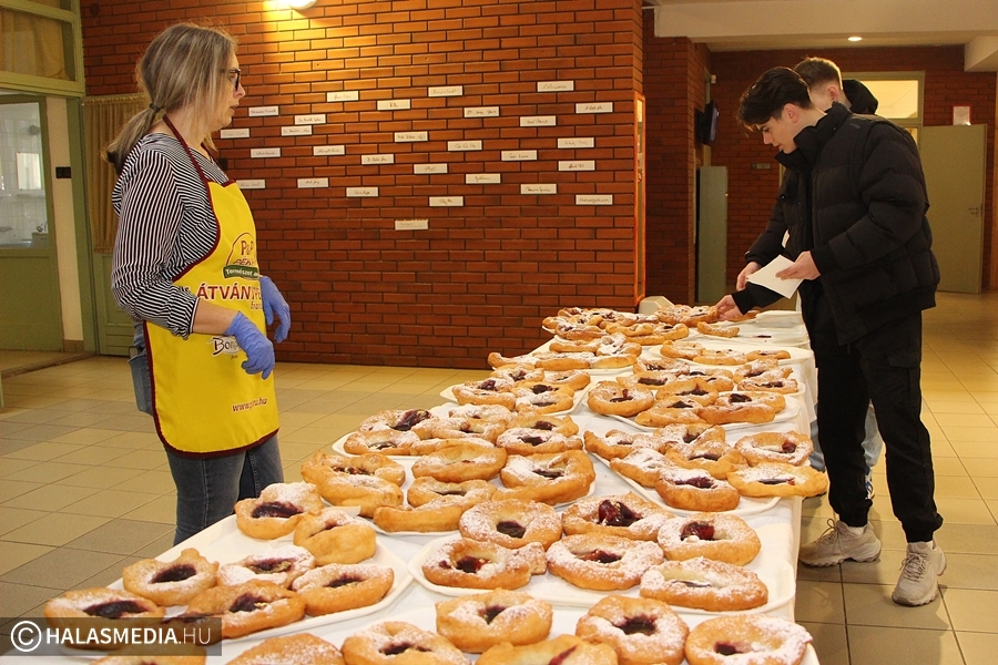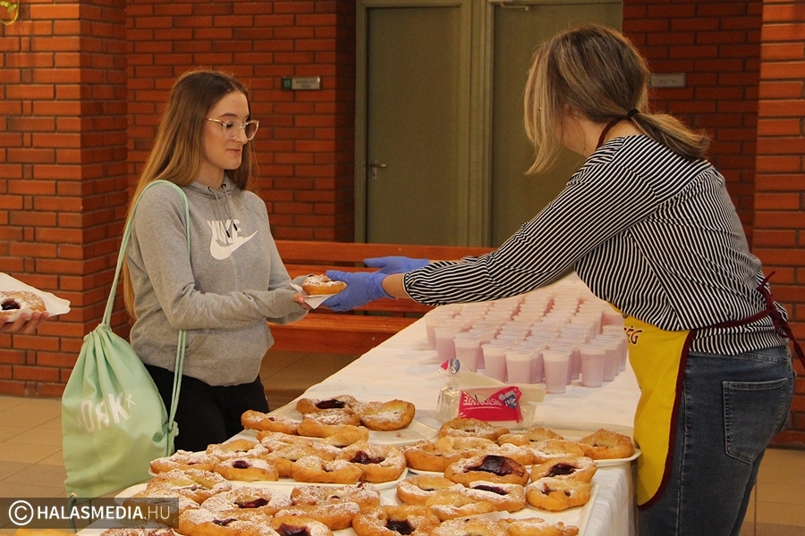 Nagy volt a nyüzsgés szerdán délelőtt a Bibó István Gimnázium aulájában. A szülői munkaközösség tagjai közel 700 fánkot sütöttek az iskola konyhájában. A friss édességeket áfonyalekvárral kínálták, a diákok legnagyobb örömére.