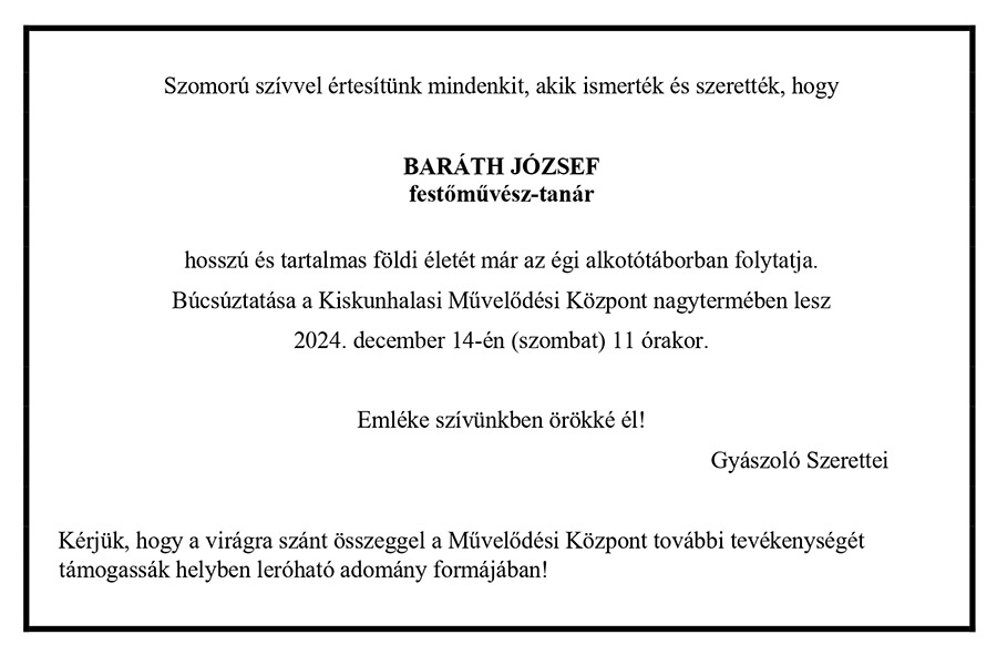 Mint korábban tájékoztattuk a nyilvánosságot arról, hogy 2024. november 5-én, életének 96. évében elhunyt Baráth József pro urbe díjas művésztanár. Időközben megjelent a Baráth József búcsúztatásáról szóló családi tájékoztatás, amely szerint december 14-én (most szombaton) 11 órakor a Kiskunhalasi Művelődési Központ (Kiskunhalas Sétáló utca 8.) nagytermében kerül sor a gyászszertartásra. További részletek az alábbiakban olvashatók!