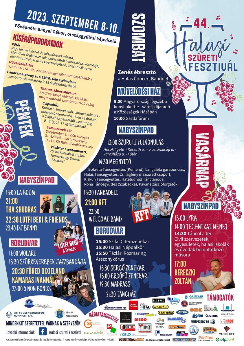 A hétvégén zajlik Kiskunhalason a 44. Szüreti Fesztivál. A szervező Halasi Városmenedzser Kft. több helyszínen változatos programkínálattal várja a látogatókat. A szüreti napok egyik legjobban várt eseménye a Borudvar, amely a városháza díszudvarán nyitotta meg kapuit. A térségi borászatok kínálata mellett folyamatos színpadi fellépések adnak megfelelő kulturális kíséretet a szabadtéri eseménynek. Pénteken kora este már sokan igyekeztek helyet foglalni a díszudvarban, hogy fogadhassák barátaikat és közösen, beszélgetéssel töltsék el az időt egy finom borral a kézben.