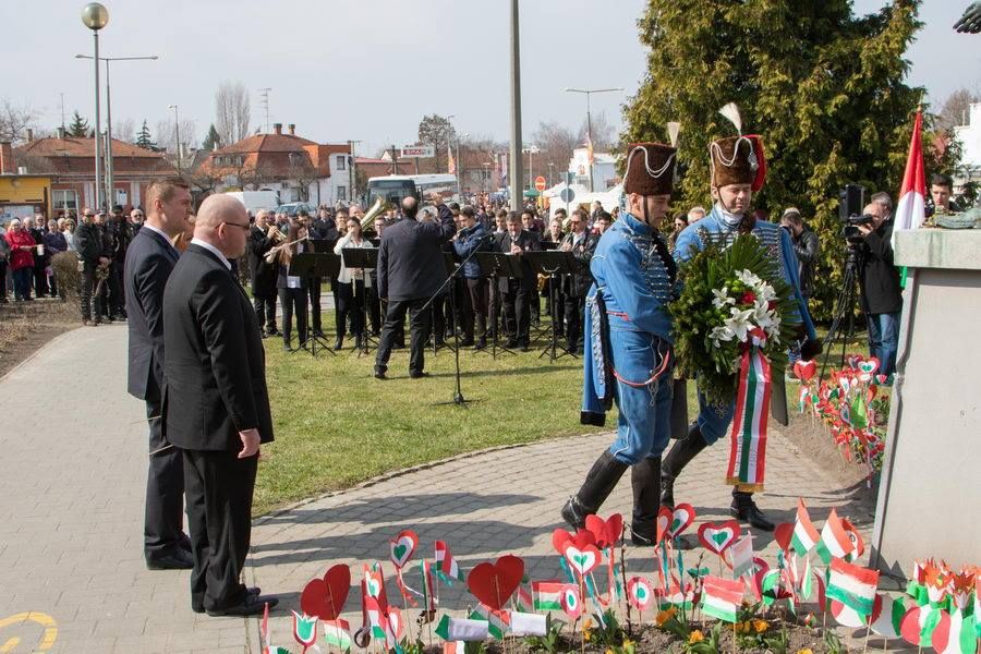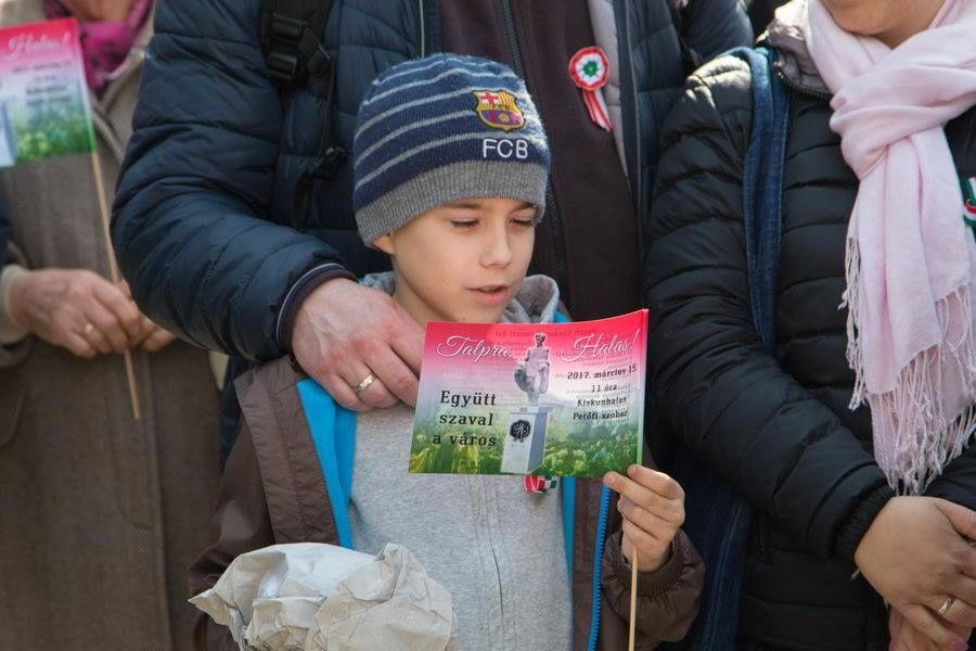A márciusi ifjakra és az ő tetteikre emlékeztek az ünneplők a városi ünnepséget követően a buszállomásnál, Petőfi Sándor szobránál. A költő tiszteletére idén is elszavalta a Nemzeti dal című versét a résztvevők sokasága.