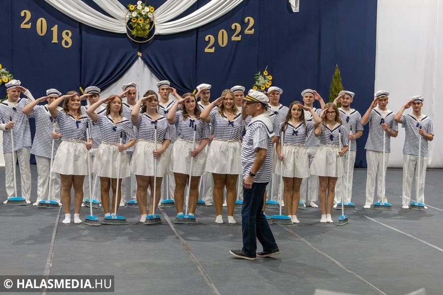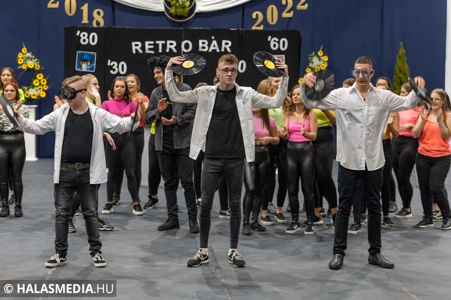 Ezt követően a közös éneklés következett, a tizenkettedikesek Demjén Ferenc dalát adták elő. A folytatásban a szalagtűzés pillanatai jöttek el. Az osztályfőnökök, Nagy László a 12. d, Molnárné Faragó Melinda a 12. c, Gurály Attila a 12. b, és Kun Hajnalka a 12. a osztályfőnöke tűzte fel a szalagokat. Az emelkedett hangulatot az osztálytáncok tovább fokozták, elsőként a 12. c mutatta meg, hogy milyen is az, amikor egy időgépet találnak az osztályteremben a tanárnőjük helyett. Zenés retró utazásra invitálta a közönséget a közösség, a taps és a siker természetesen nem maradt el.