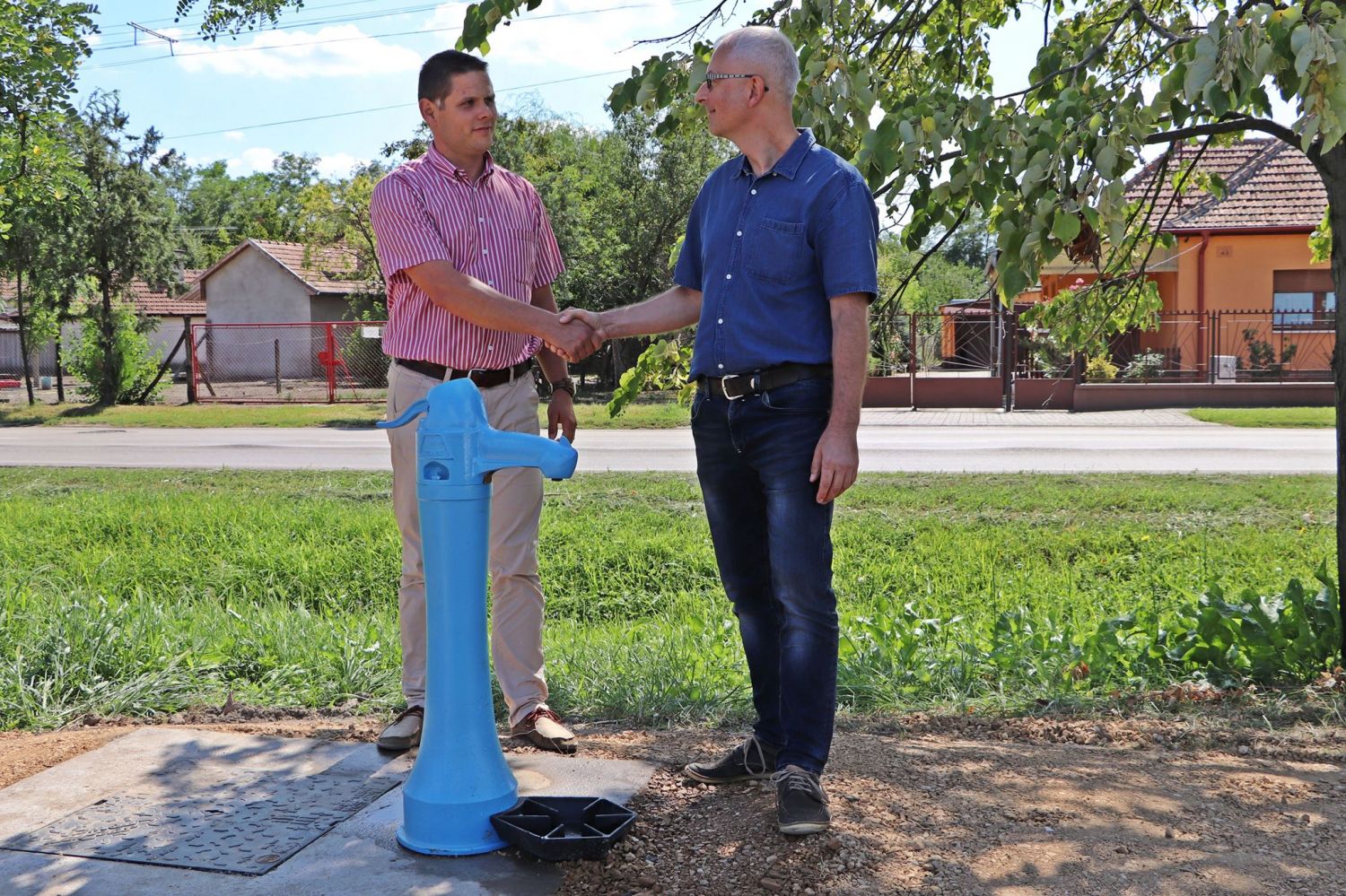 Fűzesi Péter a Kiskunvíz Kft. munkatársa átadja a megépült közkutat Dr. Skribanek Zoltánnak