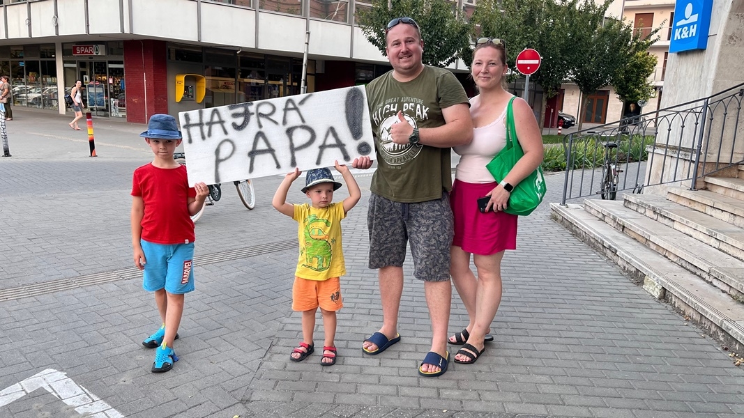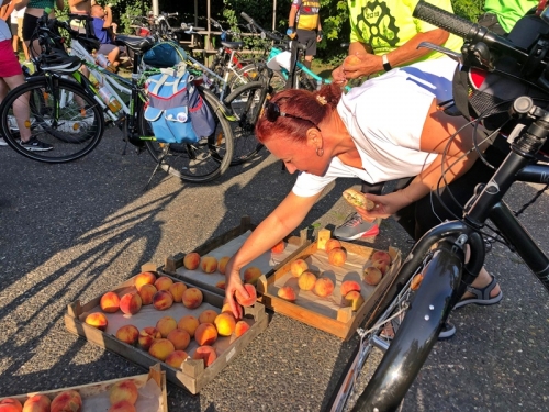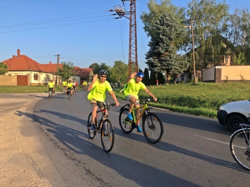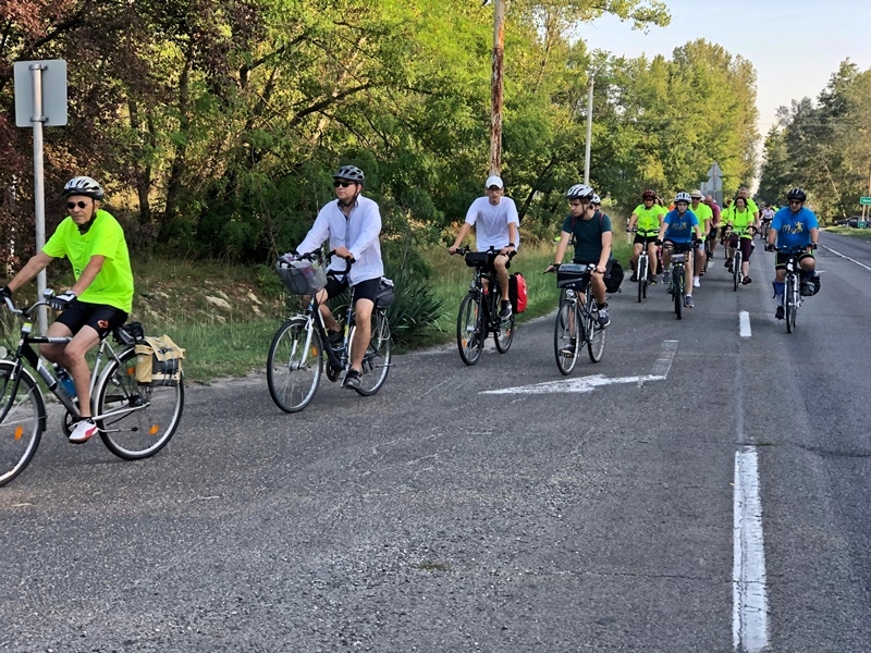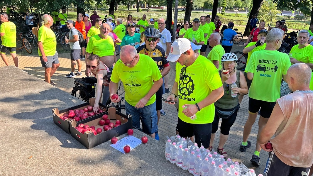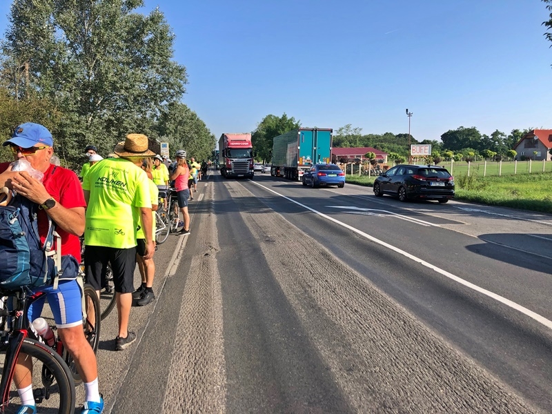 A balotaszállási megállónál egy felajánlásnak köszönhetően máris friss gyümölcsöt kaptak a vándorok. A rövid pihenőt követően tovább karikáztak az 53-as főút felújításért kiáltó aszfaltján. Király Gábor kérő szavára minden résztvevő a túrázás szabályait betartva falta a kilométereket Tompa irányába.