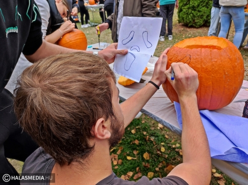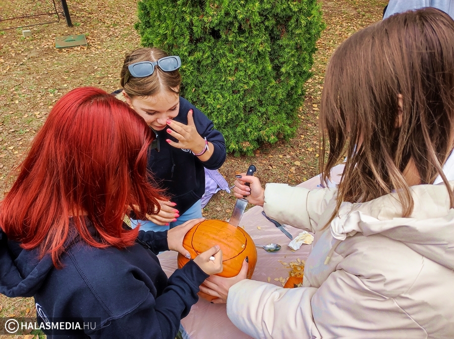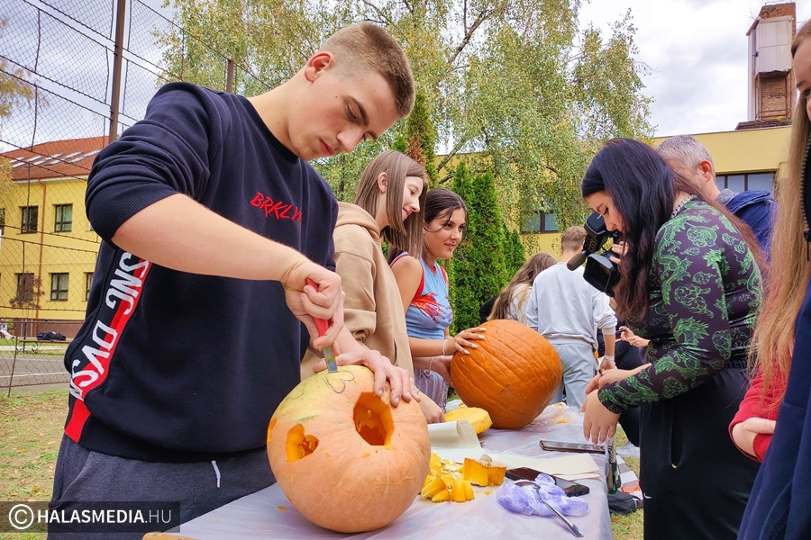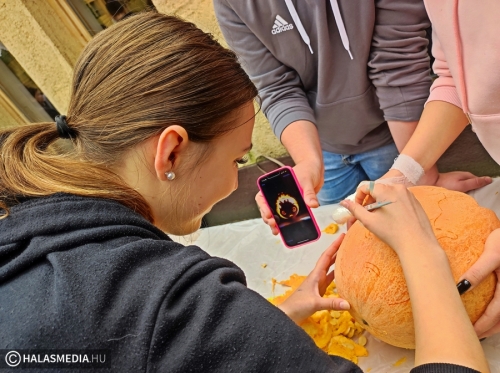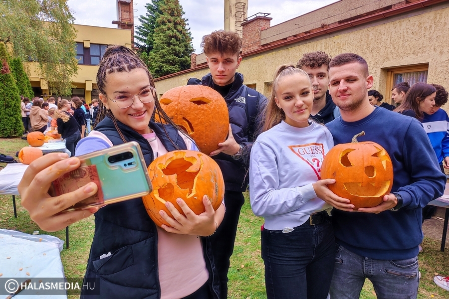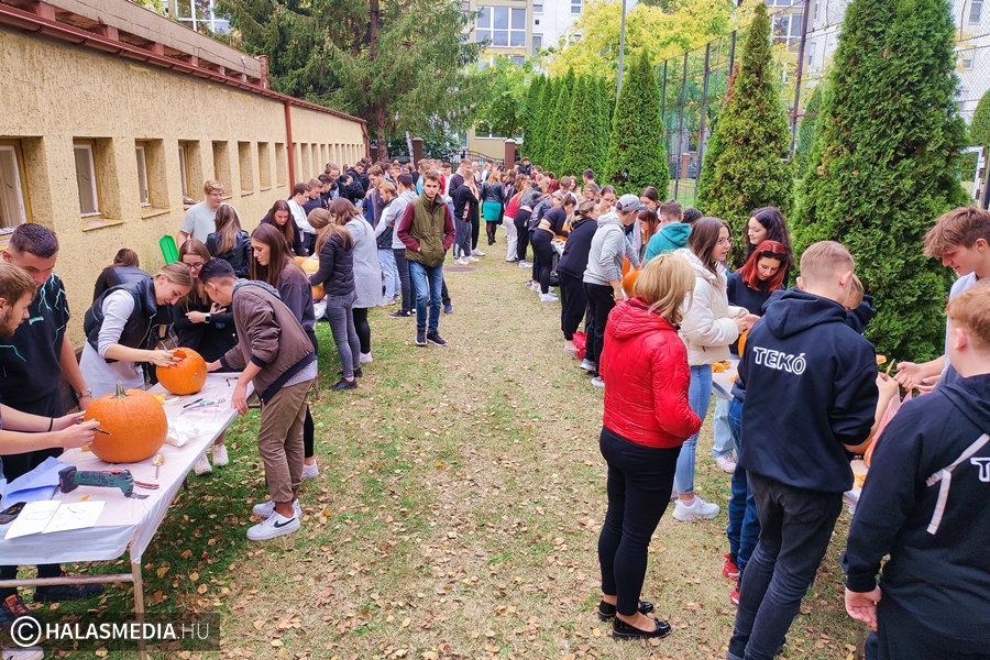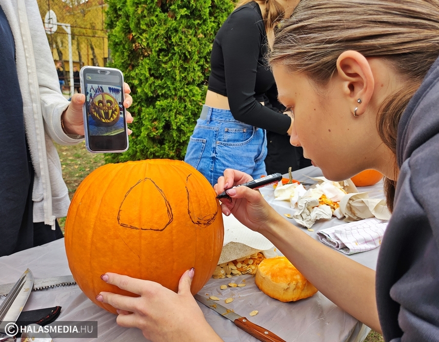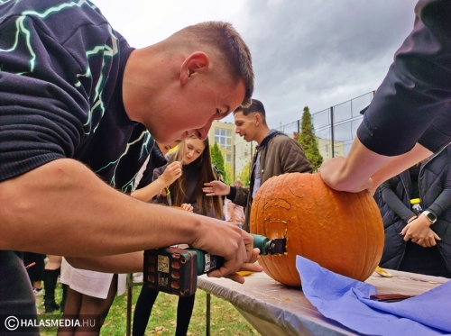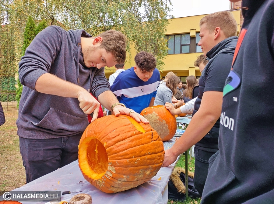 Az udvaron e közben megindult a tökfaragó verseny. A diákok nagyon kreatív ötletekkel érkeztek a helyszínre. Kinyomtatott sablonokról vagy épp a mobiltelefonjuk kijelzőjéről nézték le, milyen motívumokat kell felrajzolniuk, majd kivágniuk az alkotási folyamat során.