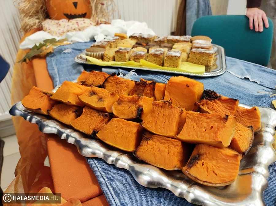 Az iskola folyosóin, több helyen is kínálták a sült tököt és a tökös süteményeket a szervezők.
