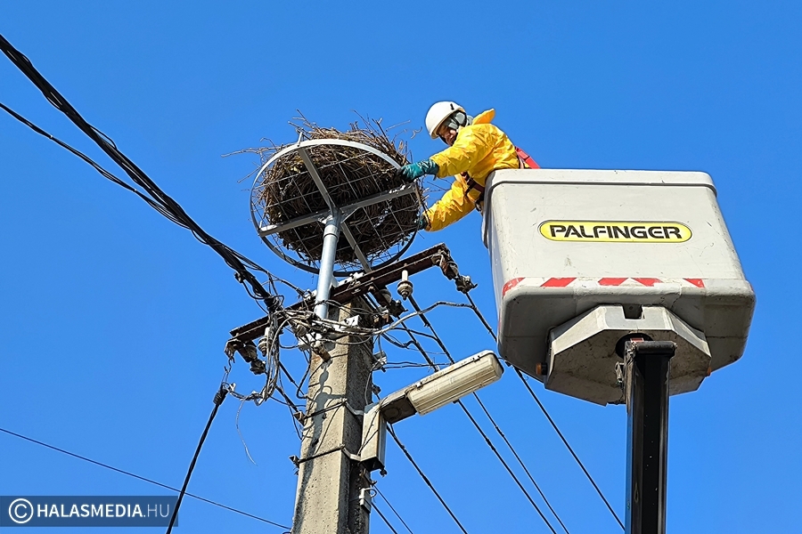 Az új fészket a Kiskunsági Nemzeti Park természetvédelmi őrkerület-vezetője készítette el és hozta Kiskunhalasra. Az áramszolgáltató szakemberei ma délelőtt helyezték fel a fémszerkezetet az oszlop tetejére, erre került rá a fészek.
