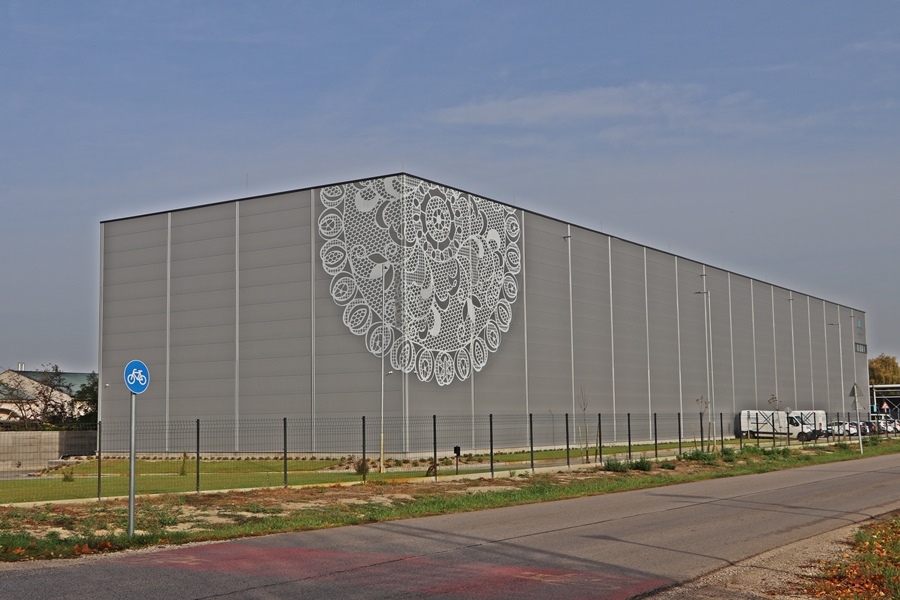 Torma Szabolcs marketing- és PR-vezető megkeresésünkre elmondta, hogy az új csarnok a tárolókapacitás bővítéséhez volt szükséges. A nagy szürke homlokzat adta magát, hogy oda valamilyen dekorációt kell készíteni. A tervezők azonnal javasolták, hogy a hungarikum halasi csipke legyen a motívum.