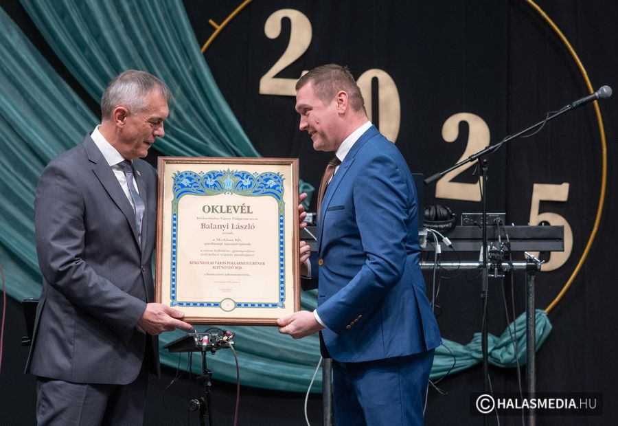 A méltatatást követően a díjról szóló díszoklevelet Fülöp Róbert polgármester nyújtotta át Balanyi Lászlónak, Kuris István László alpolgármester pedig egy díszdobozban Halasi csipkét adott át. Az ünnepelt hatalmas tapsot kapott a jelenlévőktől. Balanyi László elfogódva köszönte meg a díjat. Mindenekelőtt a jelölőknek mondott köszönetet, majd szüleinek, családjának fejezte ki háláját a támogatásukért. Beszédében kiemelte a Merkbau Zrt. vezetői kollektíváját. A gazdasági igazgató külön hangsúlyt fektetett a szakterülete munkatársainak, a gazdasági, pénzügyi, könyvelési csapat támogató munkájának elismerésére.