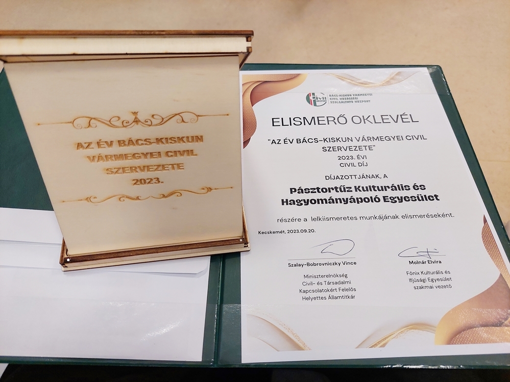 Az Év Bács-Kiskun Vármegyei Civil Szervezete díjat kapott a kiskunhalasi Pásztortűz Egyesület. A díjat Szalay-Bobrovniczky Vince, a Miniszterelnökség civil és társadalmi kapcsolatokért felelős helyettes államtitkára adta át szeptember 20-án, Kecskeméten.