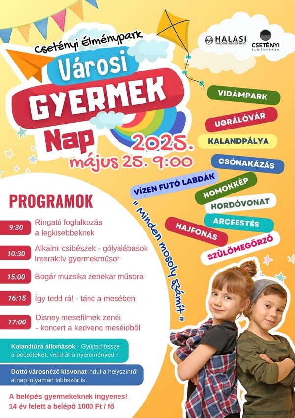 A hétvégén a gyerekeket ünnepeljük, május utolsó vasárnapja a gyermeknap. Ebből az alkalomból május 25-én a Csetényi Élménypark lesz a helyszíne a kiskunhalasi Városi Gyermeknapnak. Többféle program is várja majd a családokat, kicsiket, nagyobbakat délelőtt 9 órától.