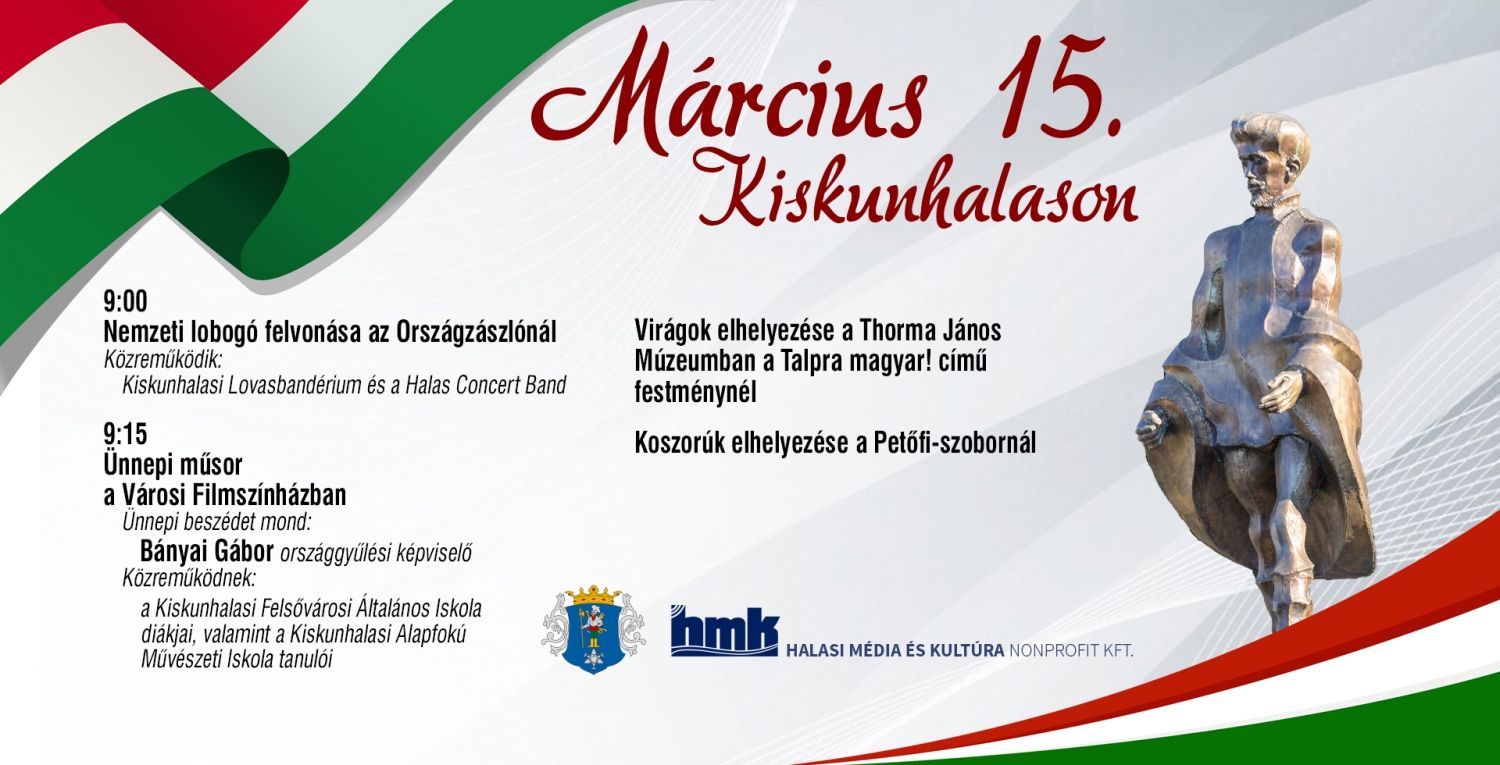 Március 15-én, kedden délelőtt 9 órakor az Országzászló emlékműnél a nemzeti lobogó felvonásával kezdődik a halasi városi ünnepség. Ezt követően a filmszínházban folytatódik a megemlékezés. Ünnepi beszédet mond Bányai Gábor országgyűlési képviselő.