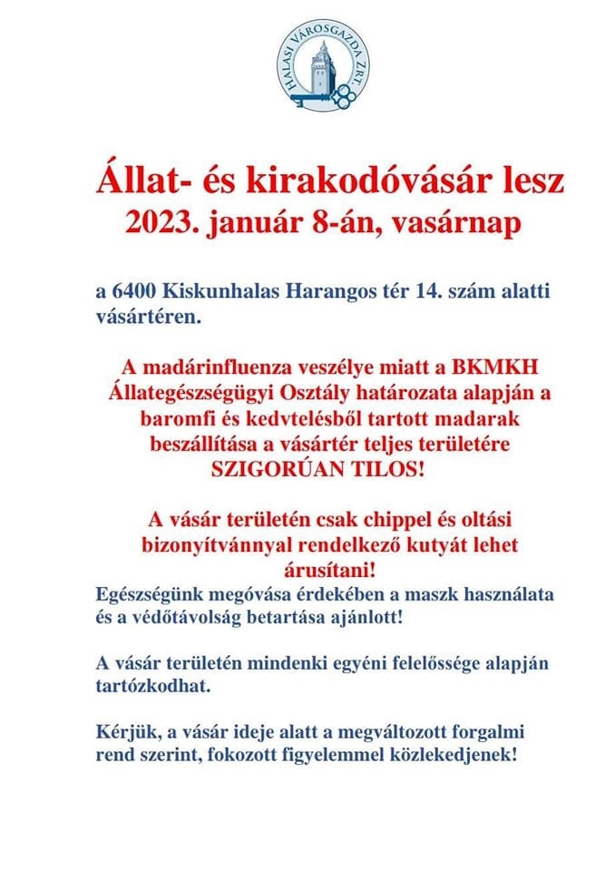 Az idei év első állat- és kirakodóvásárát tartják Kiskunhalason január 8-án, vasárnap. A Halasi Városgazda Zrt. tájékoztatója szerint a madárinfluenza veszélye miatt a kormányhivatal állategészségügyi osztályának határozata alapján baromfi, illetve kedvtelésből tartott madarak beszállítása a vásártér teljes területére szigorúan tilos. Fontos tudnivaló az is, hogy a vásár területén csak chippel és oltási bizonyítvánnyal rendelkező kutyát lehet árusítani.