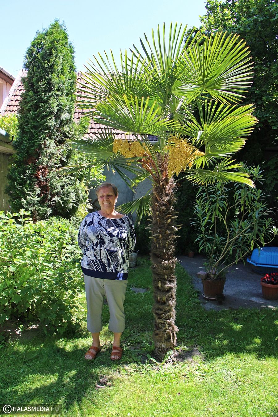 Örömmel mutatta meg udvara legnagyobb büszkeségét, a több, mint öt évtizedes pálmafát lapunk olvasóinak Gerzsenyi Andrásné. A növény idén minden eddiginél látványosabb, színes virágokat hozott, sokan csodájára jártak.