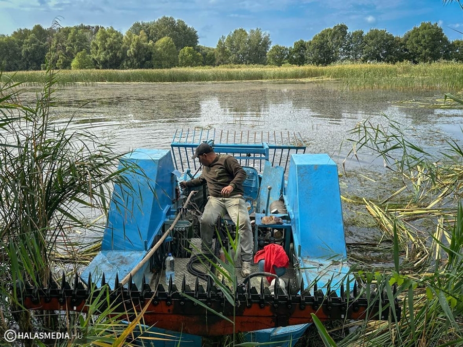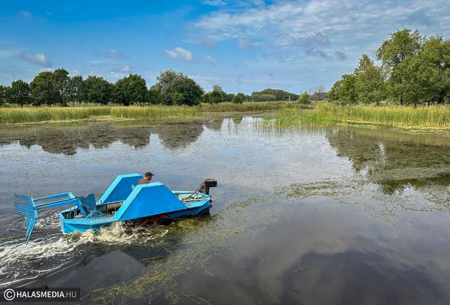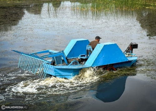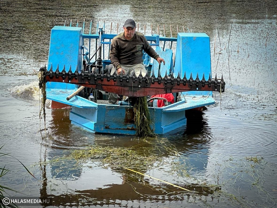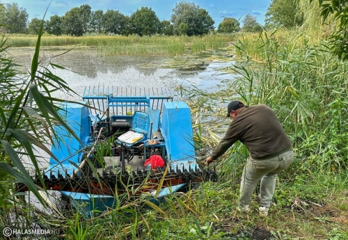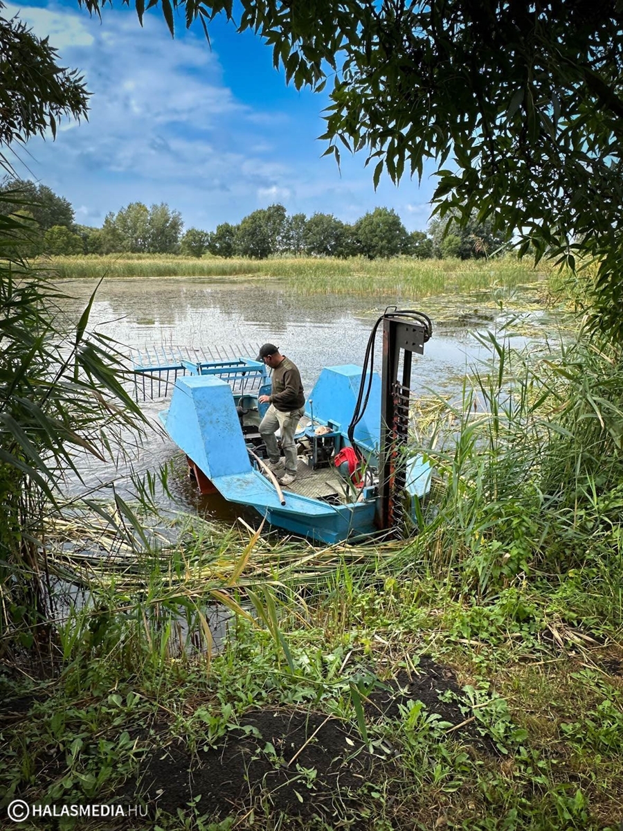 Különleges, úszó nádvágó és hínárszedő szerkezettel mentesíti a Csetényi Élménypark záportározójának csónakázható felszínét Borbély Sándor nádvágó vállalkozó. A munkát a héten kezdte a szakember és néhány nap múlva csónakkal jól bejárható hínár és nádmentes felületet ad át az üzemeltető Halasi Városmenedzser Nonprofit Kft. részére.