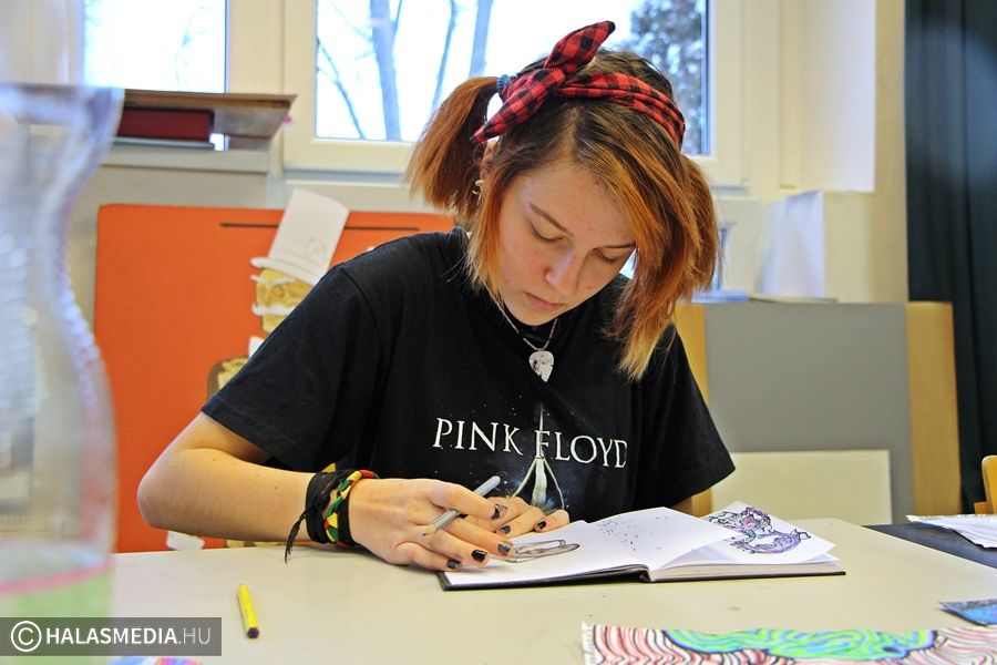 Fiatal kora ellenére Tímeának már volt három önálló tárlata, most készül a negyedikre. Képeit főként otthon készíti, de ma délelőtt beült a Bibó-gimnázium úgynevezett Sakura műhelyébe, amit azért hoztak létre, hogy a művészetek irán érdeklődő tanulók elvonulva a világ zajától, kedvük szerint alkothassanak valamely művészeti ágban.