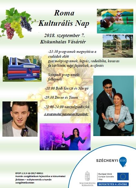 Szeptember 7-én, a Roma Kulturális Napon délután fél 2-től a gyerekeket játékok várják. A színpadi programok 6 órakor kezdődnek Bódi Guszti és Margó fellépésével. Szeptember 8-án pedig – szintén a Vásártéren – Nemzetiségi Szüreti Fesztivál lesz. Itt 13 órától főzőversennyel kezdődik a program. Amíg a bográcsokban rotyog az étel, hagyományőrző csoportok lépnek fel. Az ünnepélyes köszöntők után pedig a nap sztárvendége, Stefáno szórakoztatja a közönséget. A Nemzetiségi Szüreti Fesztivál utcabállal zárul szombaton. A zsibvásárt egy héttel később rendezik meg a Vásártéren, vagyis szeptember 16-án – közölte a Halasi Városgazda Zrt.