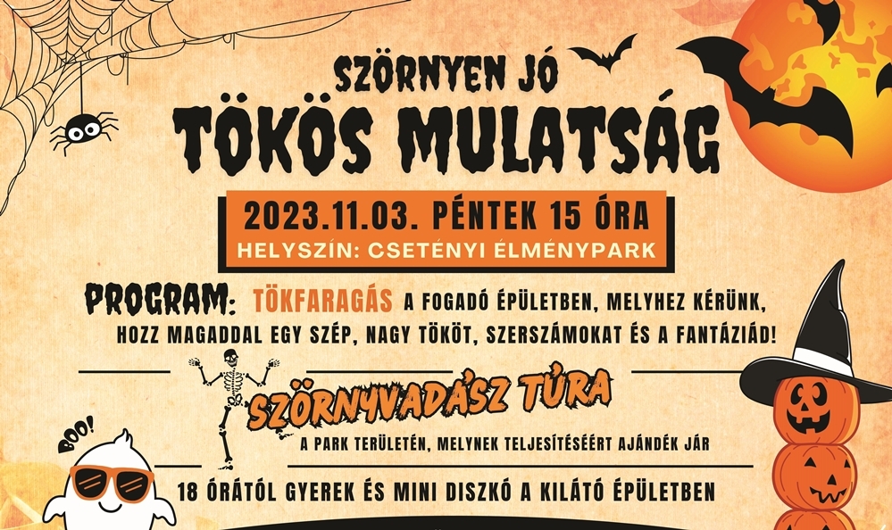 November 3-án, pénteken 15 órától szörnyen jó tökös mulatságot rendez a Halasi Városmenedzser Kft. a Csetényi Élményparkban. A fogadóépületben lehet töklámpásokat faragni, majd jön a szörnyvadász túra, aminek teljesítéséért ajándékot kapnak a gyermekek. A kilátó épületben 18 órakor kezdődik majd a gyerek és minidiszkó.