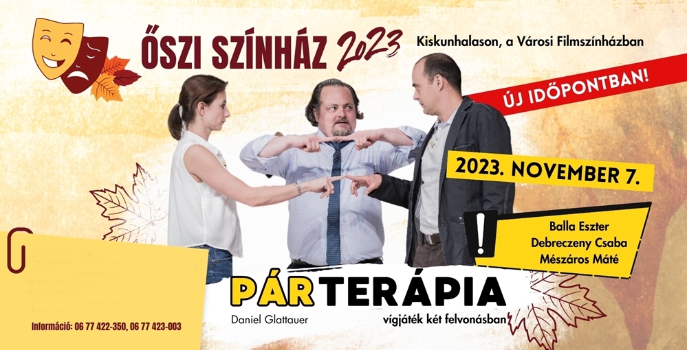 Jövő kedden zárul a kiskunhalasi őszi színházi évad. A Párterápia című két felvonásos vígjátékot 19 órától tekintheti meg a közönség. A Városi Filmszínházban Balla Eszter, Debreczeny Csaba és Mészáros Máté áll majd színpadra.