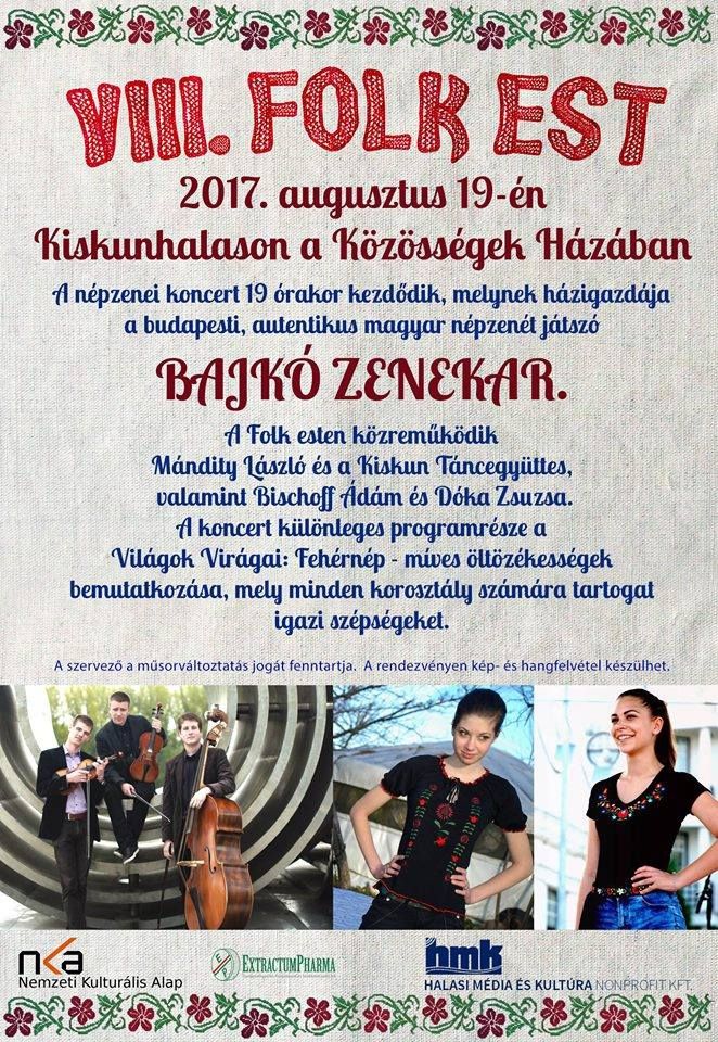 Ezúttal a budapesti, autentikus magyar népzenét játszó Bajkó zenekar lesz a házigazdája a Folk estnek. Mint megtudtuk a fővárosi fiatalok kellemes, változatos zenei anyagot válogattak össze az estére. A koncertet ez alkalommal nem csak a halasi táncosok műsora színesíti, hanem a Fehérnép- míves öltözetességek ruházati bemutatója is, melyen halasi lányok-fiúk, fiatalok és örök fiatalok működnek közre, s mutatnak be szebbnél-szebb népi motívumokkal díszített ruhákat.