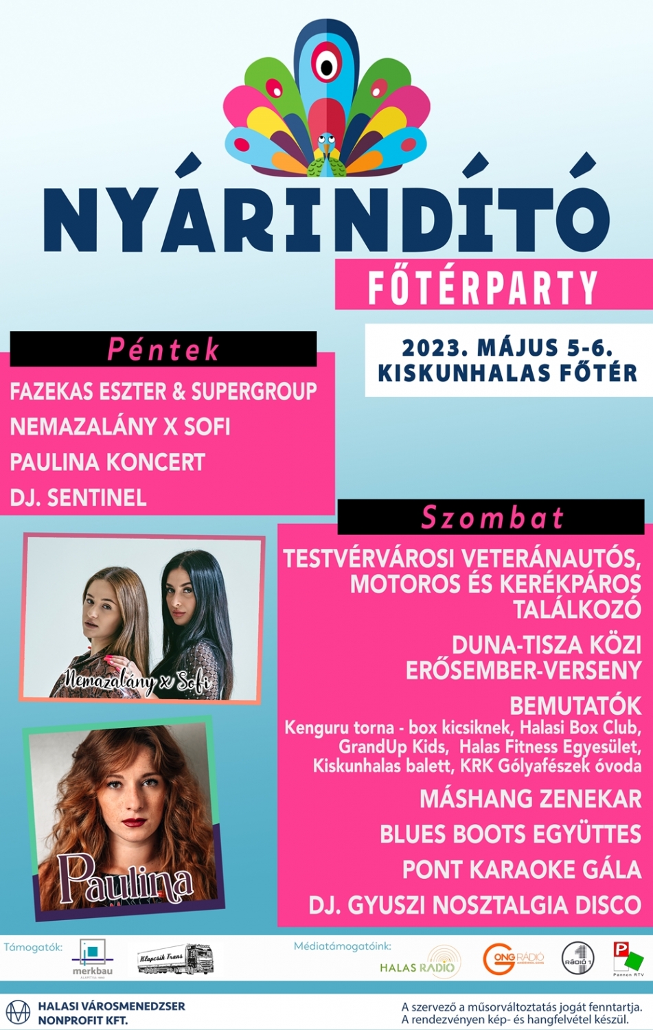 Május 5-én és 6-án, két napon keresztül remek programok, ízletes ételek és italok várják a halasiakat és környékbelieket a Nyárindító Főtérparty keretében, a Bethlen Gábor téren. A két nap során helyi zenekarok és országosan ismert előadók váltják egymást a színpadon. Itt lesz többek között Fazekas Eszter, a Nemazalány és Sofi formáció, valamint az X-faktor ezüstérmes Paulina is.