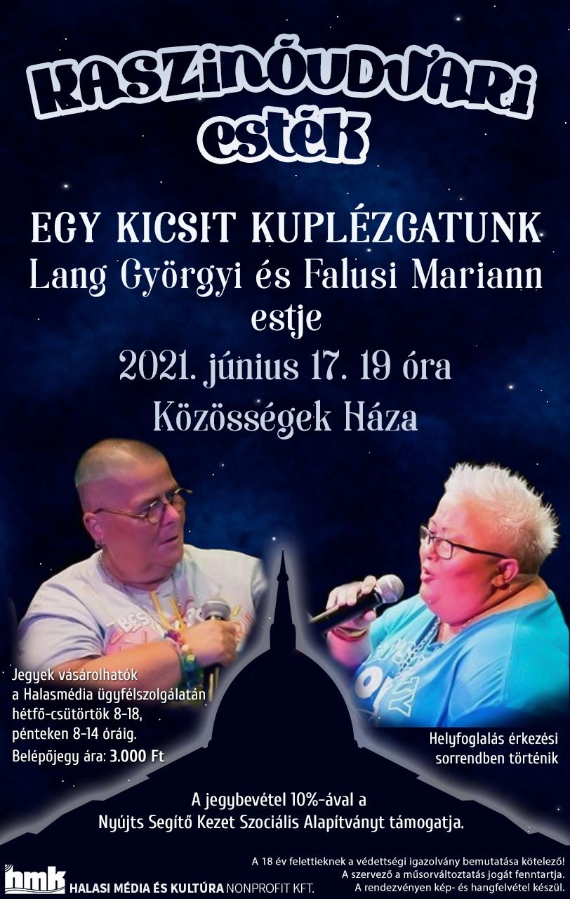 A Kaszinóudvari Esték sorozata június 17-én folytatódik. Egy kicsit kuplézgatunk – ígéri Lang Györgyi és Falusi Mariann. Az előadás 19 órakor kezdődik a Halasi Média és Kultúra Kft. szervezésében. Belépők a Halasmédia ügyfélszolgálatán, a Sétáló utca 8. szám alatt válthatók.