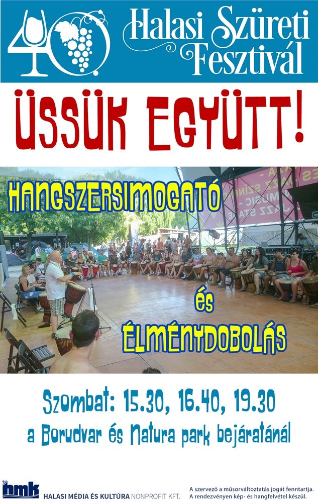 Ha eddig még nem tették, most kipróbálhatják a közös zenélést. A Halasi Szüreti Fesztivál szombat délutánján a Borudvar – városháza díszudvara – bejáratánál a fővárosi MÜPA-ból érkező Ethnosound csapata várja az érdeklődőket. Az útmutatások segítségével egyszerre 25-30 dob fog megszólalni. Bárki bekapcsolódhat majd a programba és a foglalkozás végére összeáll a zene.