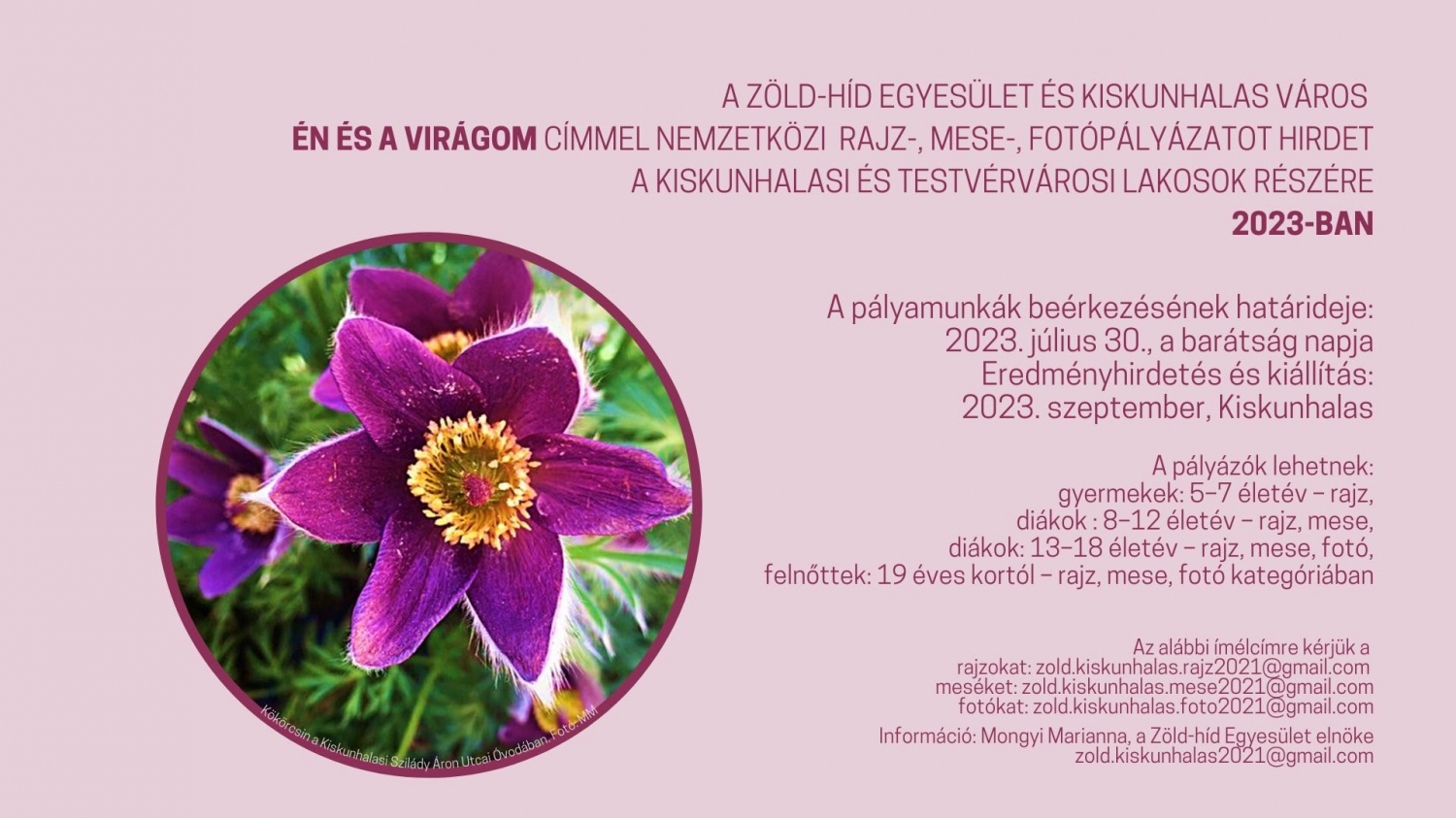 A ZÖLD-HÍD EGYESÜLET ÉS KISKUNHALAS VÁROS 2023-ban is nemzetközi pályázatot hirdet a kiskunhalasi és a testvérvárosi lakosok részére a védett virágok óvása, virágzó növények gondozása, környezetünk szépítése és védelme és a testvérvárosi kapcsolatok erősítése alkalmából.