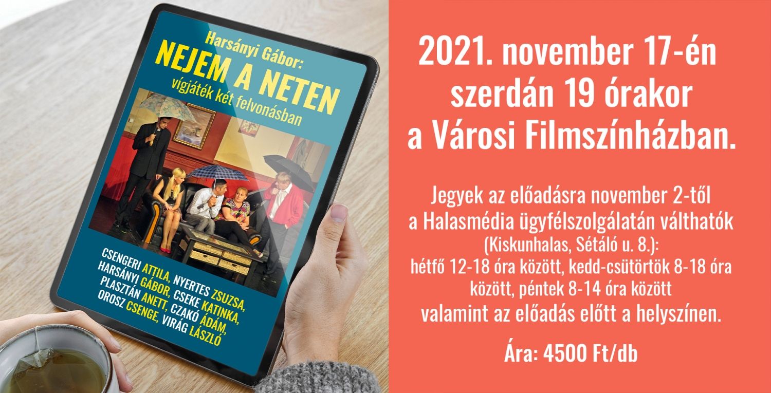 Nejem a neten – vígjáték két felvonásban. Egy újabb előadás várja Halason a színházkedvelőket. Többek között Csengeri Attila, Nyertes Zsuzsa, Harsányi Gábor és Cseke Katinka gondoskodnak a jó hangulatról. Az előadás 17-én szerdán, este 7 órakor kezdődik a filmszínházban. További információ a Halasmédia Sétáló utcai ügyfélszolgálatán kérhető.