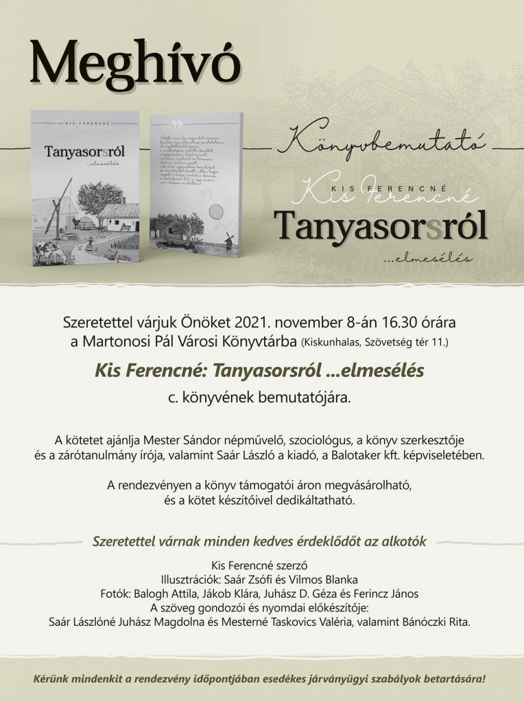 Tanyasorsról…elmesélés. November 8-án délután fél 5-kor tartják a városi könyvtárban Kis Ferencné könyvének a bemutatóját. A kötetet Mester Sándor a könyv szerkesztője, a kiadó nevében pedig Saár László ajánlja az olvasók figyelmébe.