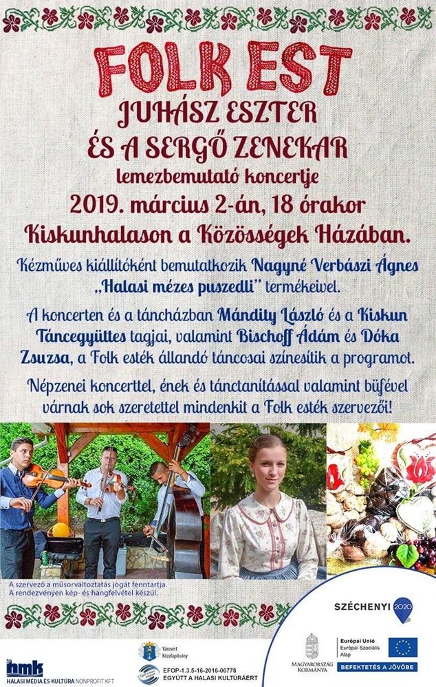 Március 2-án, szombaton Juhász Eszter és a Sergő zenekar lemezbemutató koncertjével indul Kiskunhalason a 2019-es Folk est évad. A 18 órakor kezdődő koncerten többek között magyarszováti, dél-alföldi, kalotaszegi és szászcsávási muzsikákat is hallhat majd a közönség.