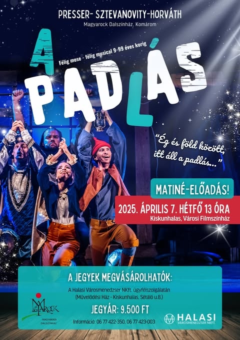 „Ég és föld között, itt áll a padlás…” és várja Kiskunhalason a színházkedvelő közönséget. Április 7-én hétfőn, igazi kuriózum előadás érkezik a kiskunhalasi filmszínház színpadára, A Presser- Sztevanovity- Horváth szerzőcsapat ikonikus darabja A PADLÁS című musical kerül bemutatásra. A komáromi Magyarock Dalszínházától korábban a Meseautó című, nagysikerű darabot láthatta a halasi közönség.