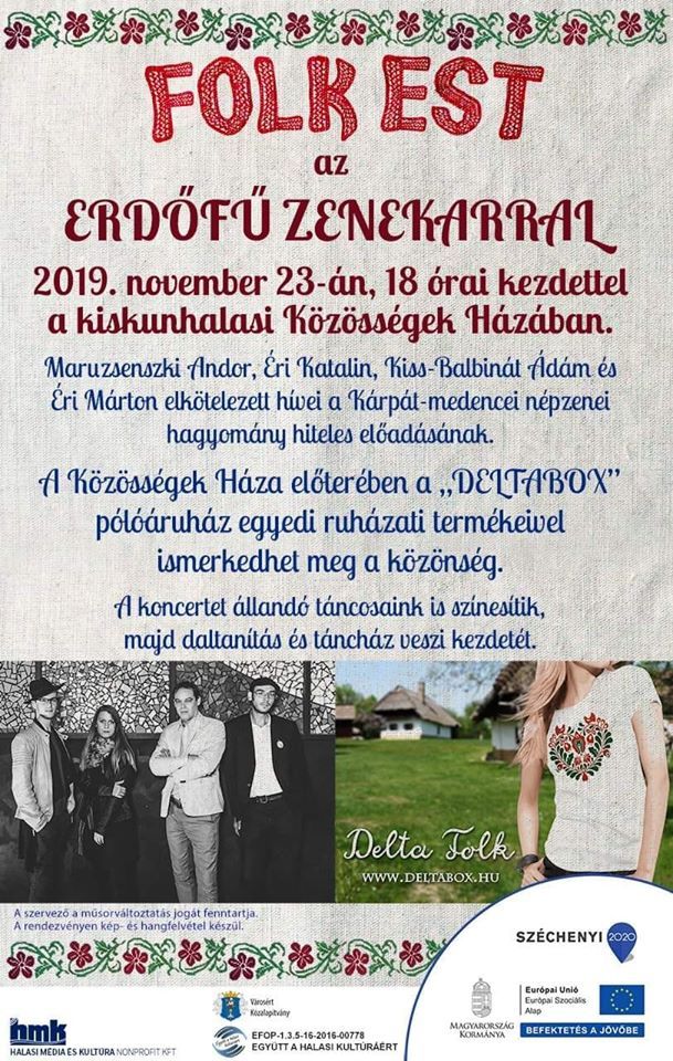November 23-án, szombaton kerül megrendezésre az év utolsó Folkestje a Közösségek Házában. A 18 órakor kezdődő koncert házigazdája ez alkalommal az Erdőfű zenekar lesz. Róluk érdemes megjegyezni, hogy számos országban, nemzetközi szinten is bizonyították már a népzene iránti elhivatottságukat. Zenekarukkal bejárták már a fél világot, így érdemes lesz ellátogatni a kiskunhalasi koncertjükre is.