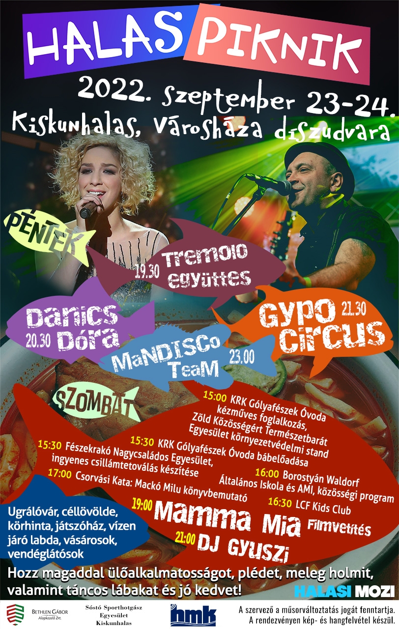 Koncertek, családi programok, szabadtéri filmvetítés a Halas Pikniken. 23-án és 24-én, vagyis pénteken és szombaton programok sokasága vár mindenkit a halasi városháza díszudvarában a Halasi Média és Kultúra kft. szervezésében. A program a tervezetthez képest némi módosítással indul, mivel elmarad a Halas Concert Band pénteken 18 órára hirdetett koncertje.