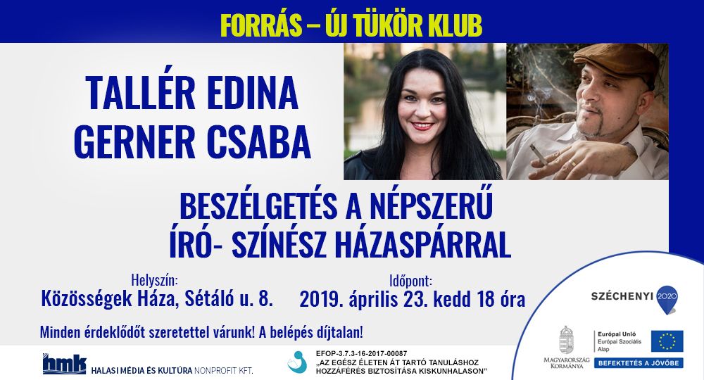 Könyvekről, színészszerepekről, életük alakulásáról beszélnek a kedden 18 órakor kezdődő műsorban, a kiskunhalasi Közösségek Házában (Sétáló u. 8.). Természetesen a beszélgetés során a közönség is bátran kérdezhet. A belépés most is díjtalan. A program végén Edina dedikálja könyveit, melyek a helyszínen beszerezhetők.
